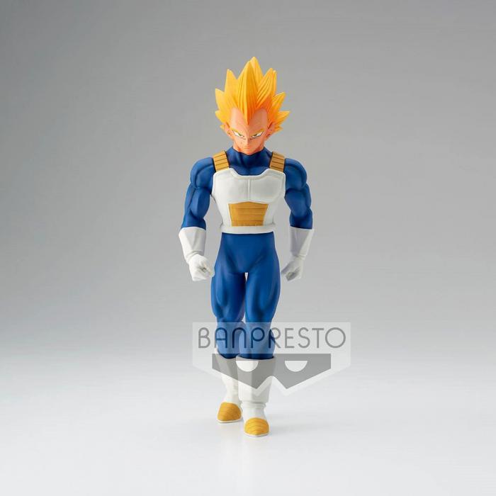 Esta figura de PVC mide aproximadamente 21 cm de altura y viene con su peana. Representa a Vegeta en modo Super Saiyan, caminando con los puños cerrados, los brazos a lo largo del cuerpo. Su atuendo azul y blanco es fiel al que usa en el manga y el anime. Su rostro expresa su determinación y su ira, propias de su carácter.