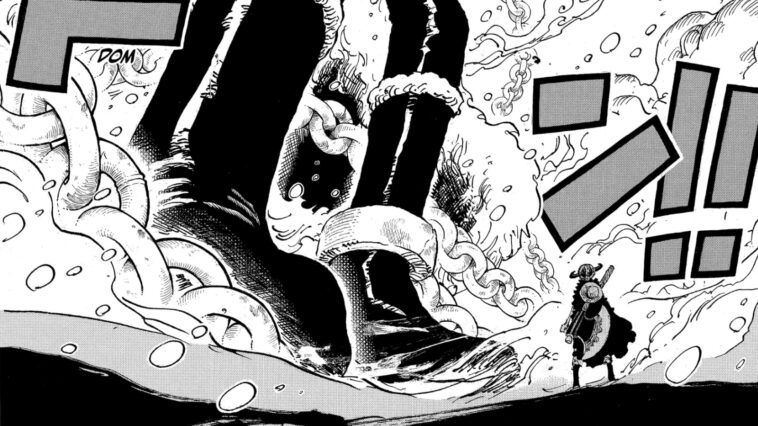 Eiichiro Oda/ShueishaEl gigante ha recuperado el uso de sus brazos y ha aprovechado la oportunidad para hacerse con su arma Ragnir, que parece permitirle invocar el rayo. Frente a los miembros del Nuevo Equipo de Gigantes, así como a Luffy y Zoro, el príncipe exige recuperar su libertad total, de lo contrario, no dudará en atacar.