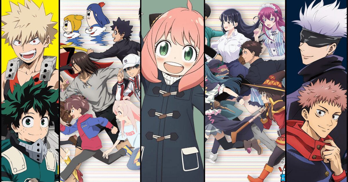 De izquierda a derecha: Yowamushi Pedal, Haikyū!!, My Hero Academia, Dr. STONE, JUJUTSU KAISEN, Mushoku Tensei: Jobless Reincarnation, SPY x FAMILY, Pampered by the Angel Next Door y ONIMAI: I’m Now Your Sister