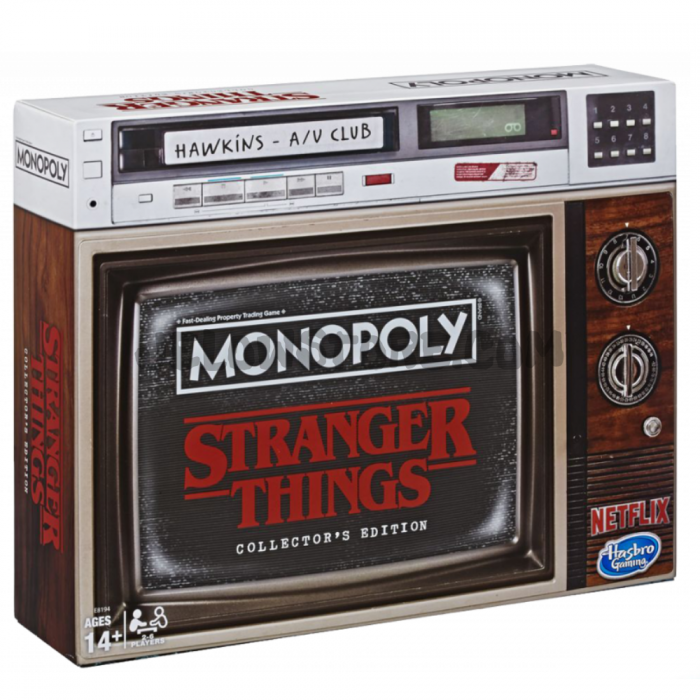 Con respecto a este Monopolio en Edición de coleccionista, su caja representa un antiguo televisor CRT coronado por un videograbador VHS, y es realmente soberbio. En el interior, hay peones rediseñados a imagen de la serie de televisión: