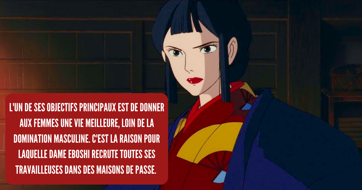 De hecho, uno de sus principales objetivos es dar a las mujeres una vida mejor, lejos de la dominación masculina. Esta es la razón por la que Dame Eboshi está reclutando todos sus trabajadores en burdeles.