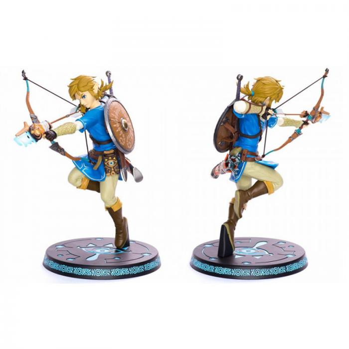 La figura de coleccionista XL de Link lo presenta con su atuendo azul mientras dibuja su arco con una flecha de hielo en un pie. En su espalda también encontramos su famoso escudo. Este último está colocado sobre una base muy bonita que nos recuerda una vez más al videojuego. La leyenda de Zelda Aliento de lo salvaje en el interruptor de Nintendo. En cuanto a sus dimensiones, mide nada menos que 25 cm de alto.